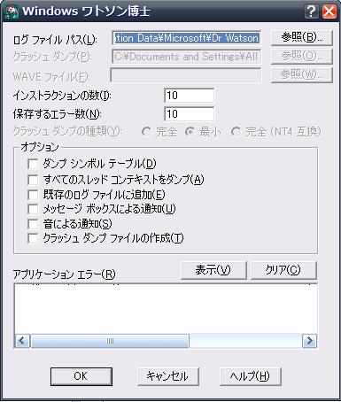 「スタート」~「ファイル名を指定して実行」~「drwtsn32と入力してOK」