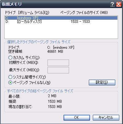 Cドライブをクリックして「ページングファイルなし」にチェック「設定」